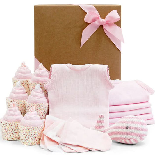 - Cute as a Cupcake Baby Girl Gift Box - This delightful gift box features an array of mouthwatering cupcakes topped with colourful frosting and sprinkles, accompanied by a bottle of sparkling apple juice for a touch of celebration. We package it elegantly and tie it with a ribbon, too.